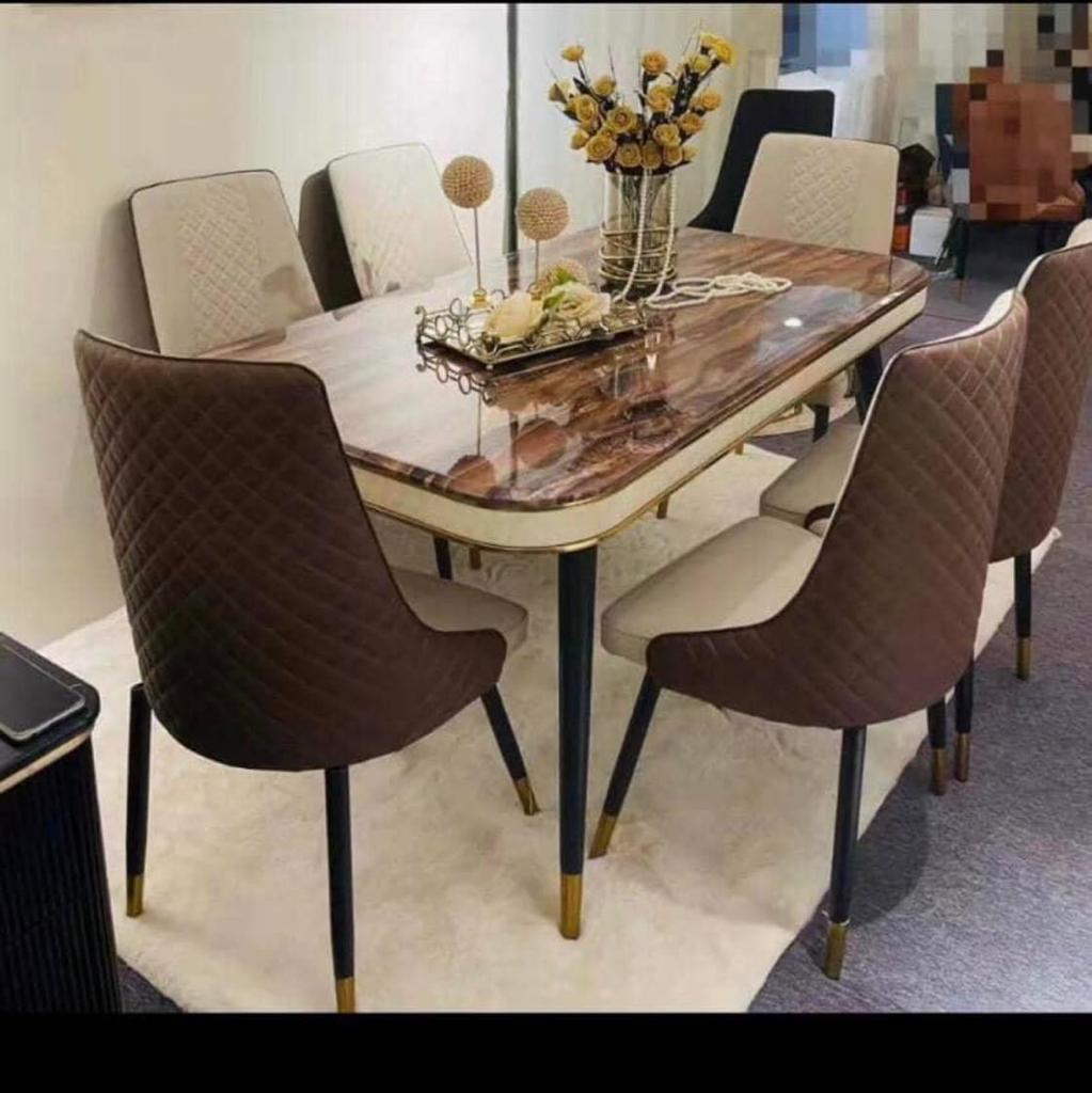 - High-polish frames in gold, and high-density foam cushions in luxurious faux leather, the chairs set a solid new look.